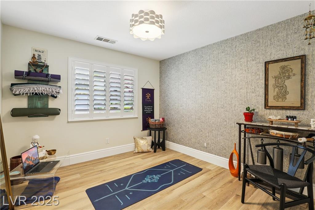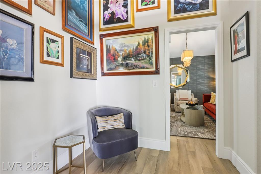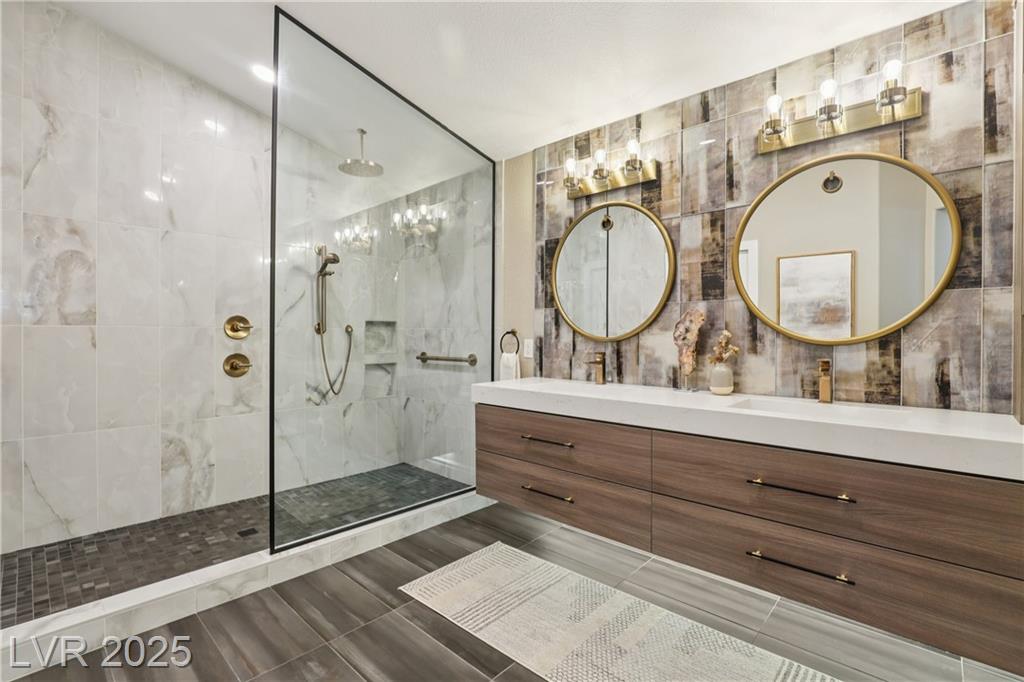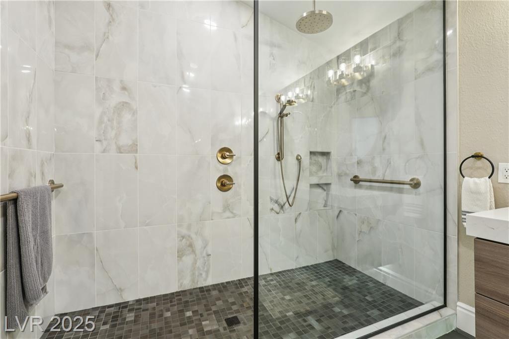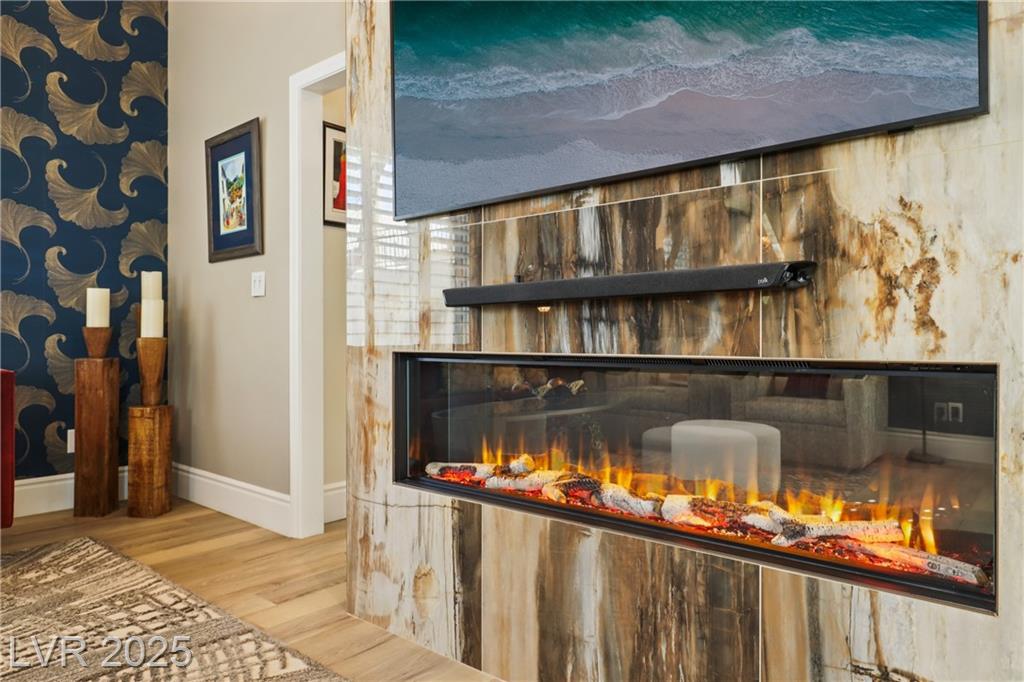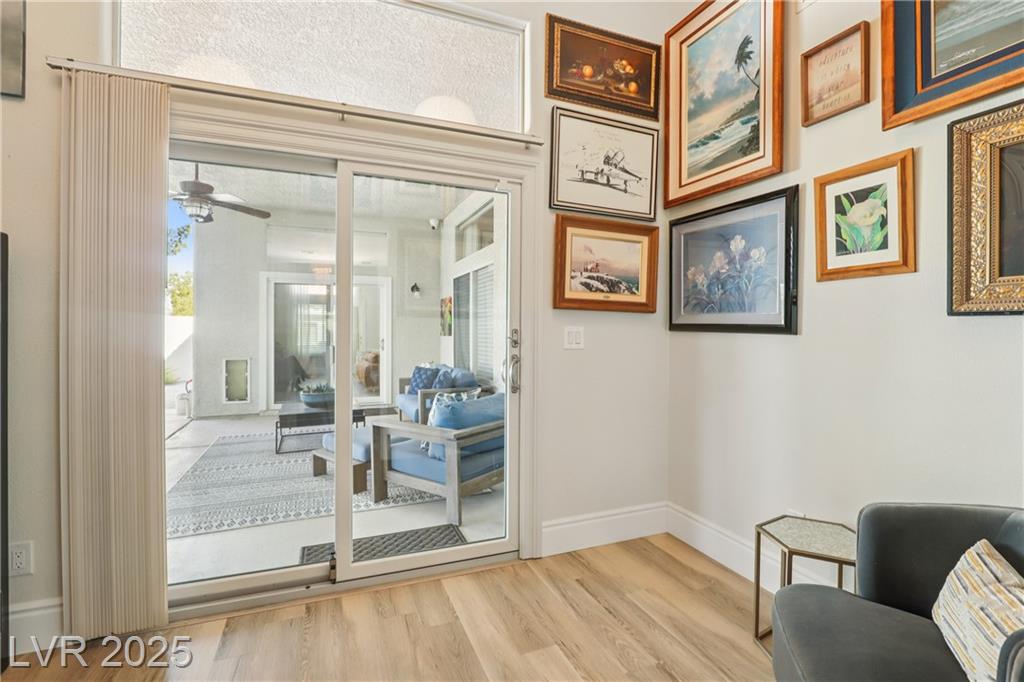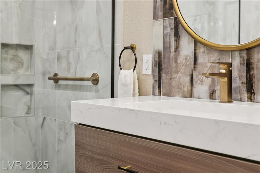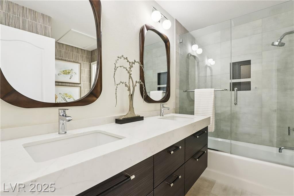 Modern elegance meets prime Green Valley living! This beautifully updated 4-bed, 2.5-bath home offers 2,956 sq ft, a 3-car garage, and OWNED SOLAR. Professionally designed with custom cabinetry in the baths and kitchen, including large drawers, stainless steel appliances, and an under-counter ice maker. Enjoy a large primary suite with a sitting room and a luxurious bathroom. Designer lighting, new flooring, tiled bathroom walls, black walnut accent walls, and curated finishes create a polished, elevated feel throughout. Enjoy newer A/C units, new west-facing windows, and an extended patio cover overlooking a spacious backyard with room for a pool. Move into a newly epoxied garage floor, plus fresh pavers and landscaping, both front and rear. Perfectly located within walking distance to The District, Lifetime Fitness, and Green Valley Ranch Resort, and zoned for top-rated schools. Experience the best of Green Valley living in a home that blends comfort, style, & unbeatable convenience.